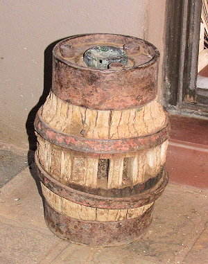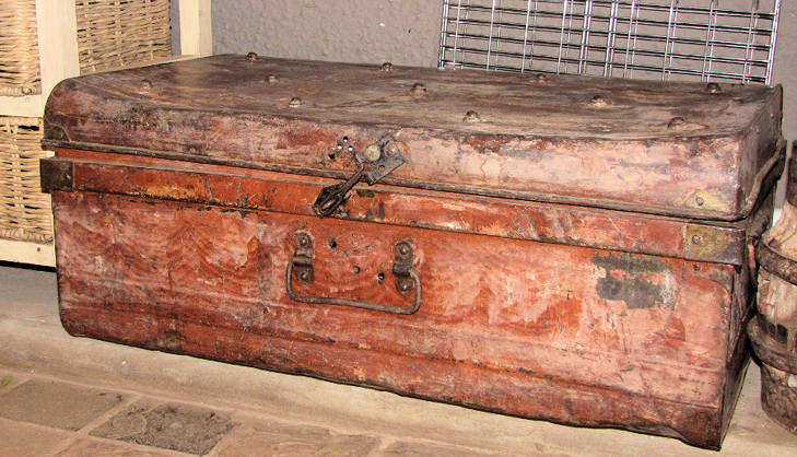 An old rusted look tin toolbox (trunk) serves as valuable container for all our barbecue equipment such as the charcoal and wood.