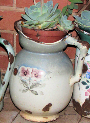 Old and rusted ewers found on a dumping site  by an uncle of mine was passed on to me and also has a purpose as succulent containers on our farm-like veranda (stoep) and it helps to create the rustic and old fashioned look on our outside living space.