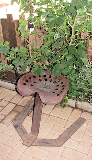 The tractor chair had no use when it was collected from the dumping site but a pedestal was made for it and now this chair has a purpose and contributes to the farm-like look of this veranda (stoep).
