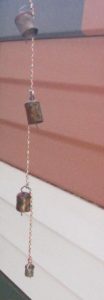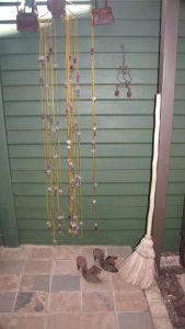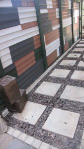 The passage between the house and concrete fence wall gives access to the back yard. My rusted garden ornaments received as gifts over many years, grass broom and the rusted tin containers used for food storing years ago all have found a place here.